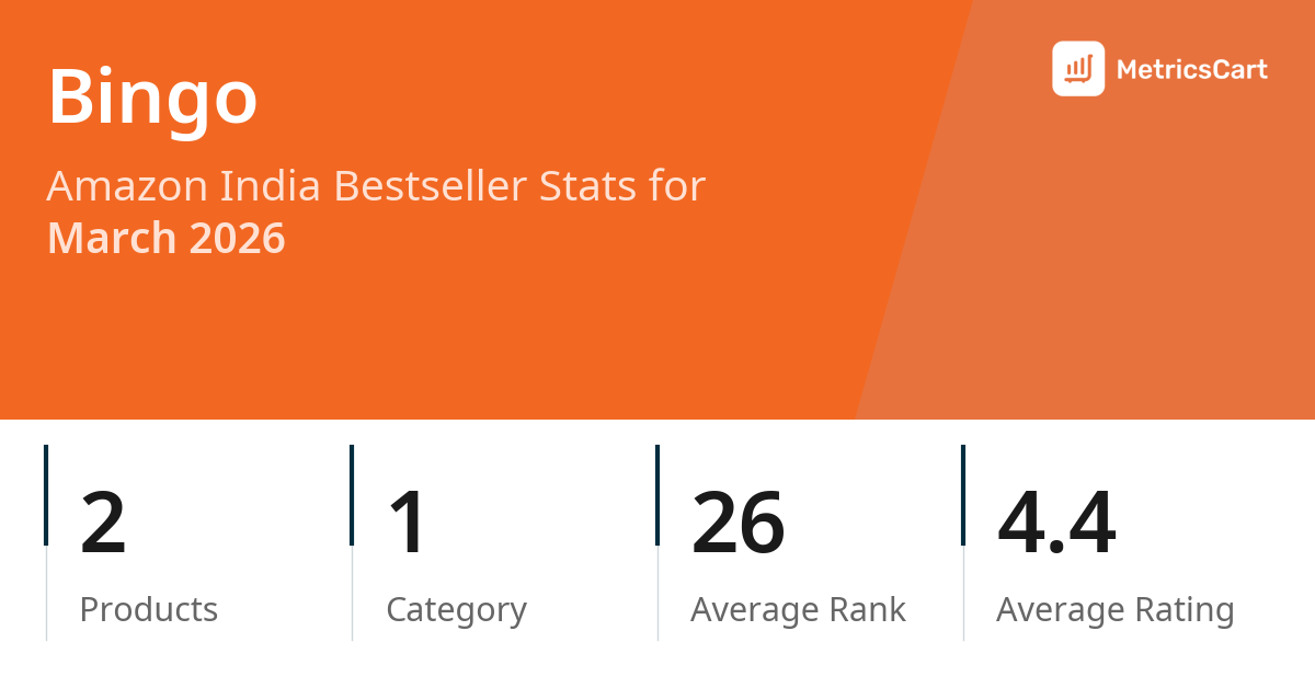 In March 2026, Bingo appeared on Amazon India's bestseller lists with 2 unique products across 1 category. These products appeared in the category Grocery & Gourmet Foods. The brand's products on the bestseller lists were priced between ₹14.00 and ₹30.00, with an average price of ₹23.00. These bestselling products maintained an average rating of 4.4 based on 26K total ratings from customers who purchased products that appeared on the bestseller lists.