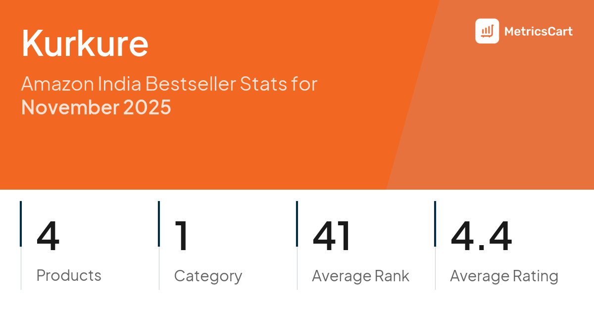 In November 2025, Kurkure appeared on Amazon India's bestseller lists with 4 unique products across 1 category. These products appeared in the category Grocery & Gourmet Foods. The brand's products on the bestseller lists were priced between ₹9.00 and ₹20.00, with an average price of ₹12.67. These bestselling products maintained an average rating of 4.4 based on 40K total ratings from customers who purchased products that appeared on the bestseller lists.