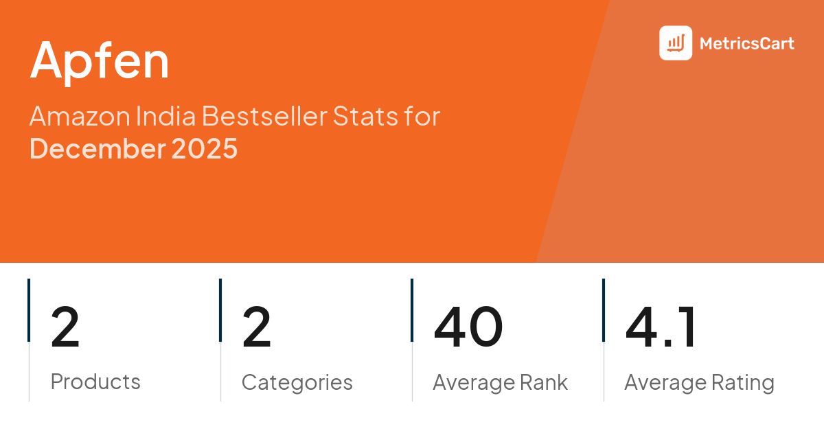 In December 2025, Apfen appeared on Amazon India's bestseller lists with 2 unique products across 2 categories. These products appeared in categories including Electronics and Computers & Accessories. The brand's products on the bestseller lists were priced between ₹273.00 and ₹463.00, with an average price of ₹285.67. These bestselling products maintained an average rating of 4.1 based on 20K total ratings from customers who purchased products that appeared on the bestseller lists.