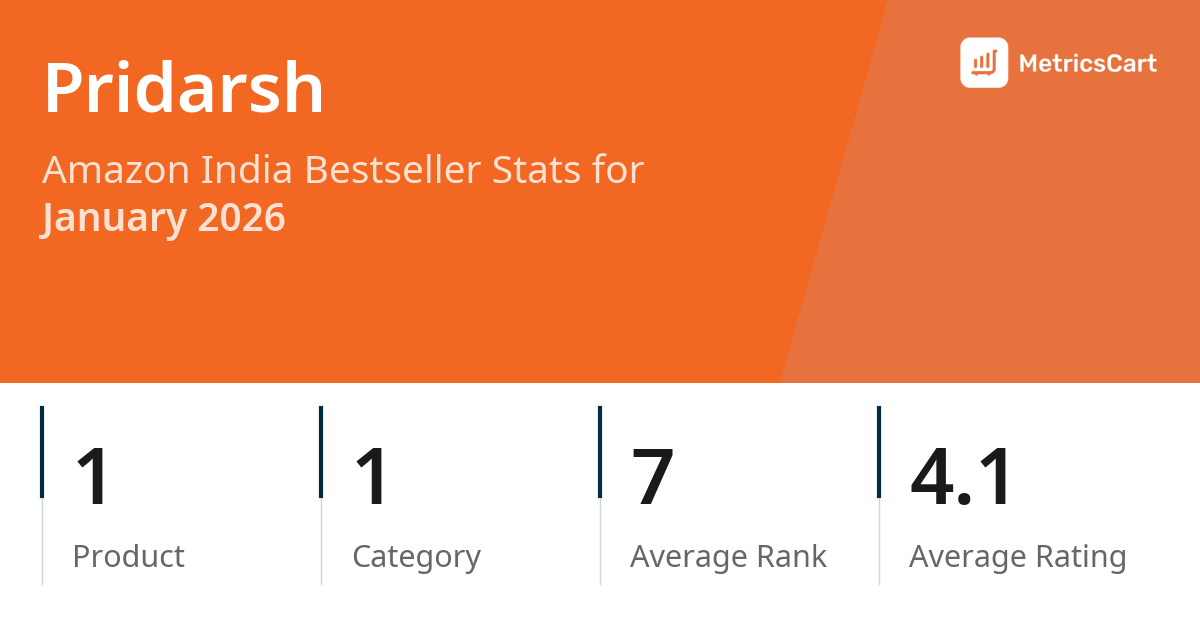 In January 2026, Pridarsh appeared on Amazon India's bestseller lists with 1 unique product across 1 category. These products appeared in the category Industrial & Scientific. The brand's products on the bestseller lists were priced between ₹369.00 and ₹419.00, with an average price of ₹404.14. These bestselling products maintained an average rating of 4.1 based on 580 total ratings from customers who purchased products that appeared on the bestseller lists.