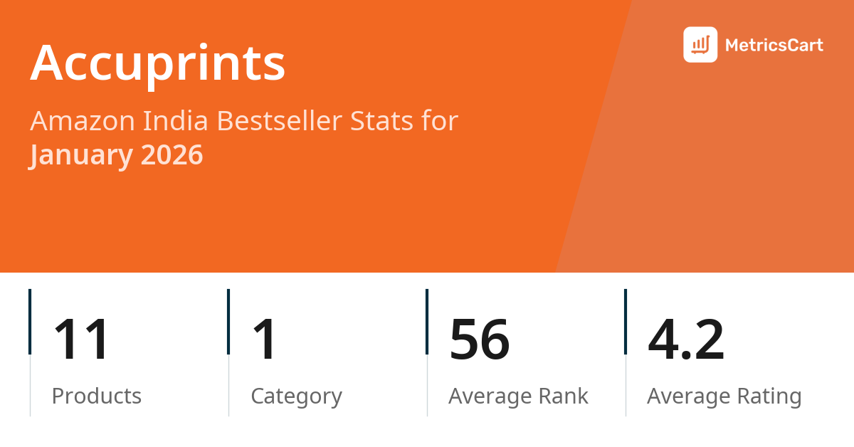 In January 2026, Accuprints appeared on Amazon India's bestseller lists with 11 unique products across 1 category. These products appeared in the category Office Products. The brand's products on the bestseller lists were priced between ₹129.00 and ₹299.00, with an average price of ₹219.35. These bestselling products maintained an average rating of 4.2 based on 10K total ratings from customers who purchased products that appeared on the bestseller lists.