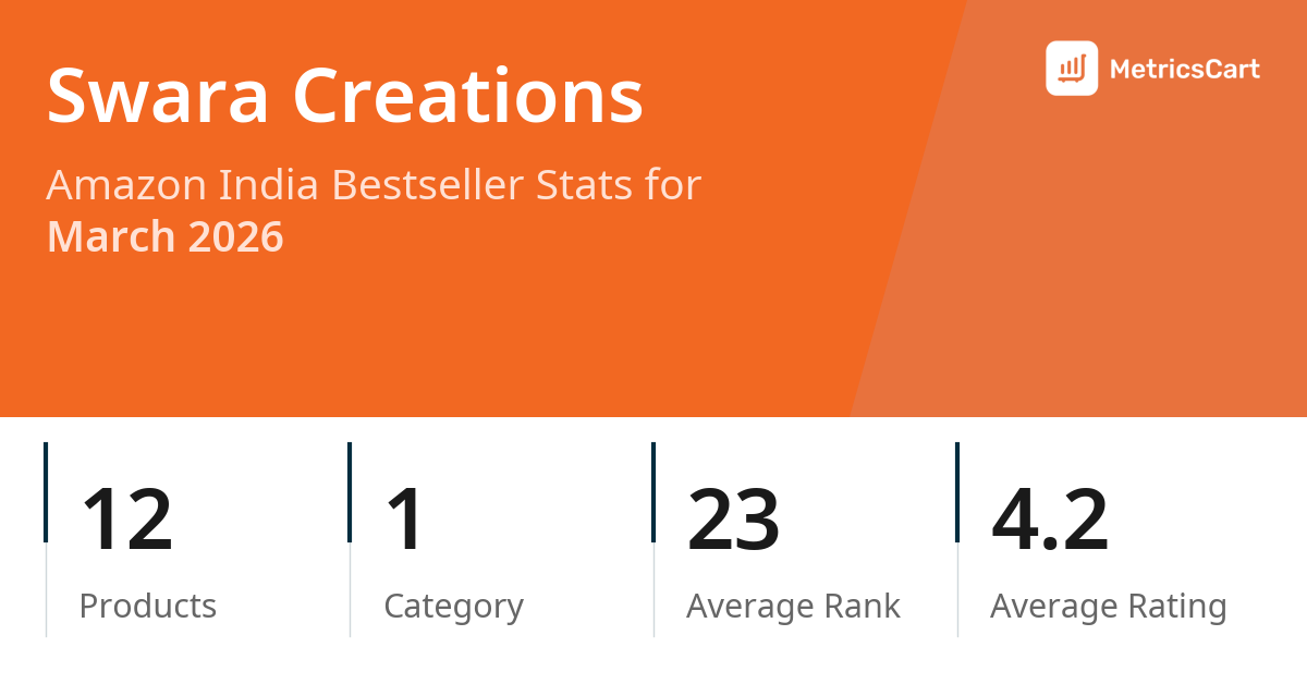 In March 2026, Swara Creations appeared on Amazon India's bestseller lists with 12 unique products across 1 category. These products appeared in the category Jewellery. The brand's products on the bestseller lists were priced between ₹499.00 and ₹599.00, with an average price of ₹552.32. These bestselling products maintained an average rating of 4.2 based on 55 total ratings from customers who purchased products that appeared on the bestseller lists.