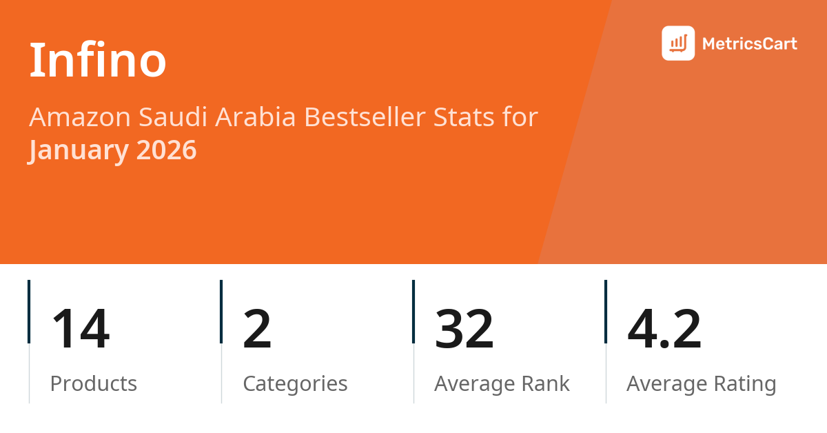 In January 2026, Infino appeared on Amazon Saudi Arabia's bestseller lists with 14 unique products across 2 categories. These products appeared in categories including Fashion and DIY & Tools. The brand's products on the bestseller lists were priced between SAR 25.00 and SAR 69.99, with an average price of SAR 39.86. These bestselling products maintained an average rating of 4.2 based on 5K total ratings from customers who purchased products that appeared on the bestseller lists.