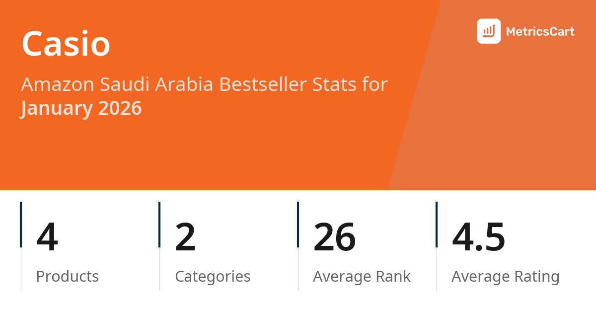 In January 2026, Casio appeared on Amazon Saudi Arabia's bestseller lists with 4 unique products across 2 categories. These products appeared in categories including Office Products and Fashion. The brand's products on the bestseller lists were priced between SAR 58.70 and SAR 89.00, with an average price of SAR 72.53. These bestselling products maintained an average rating of 4.5 based on 94K total ratings from customers who purchased products that appeared on the bestseller lists.