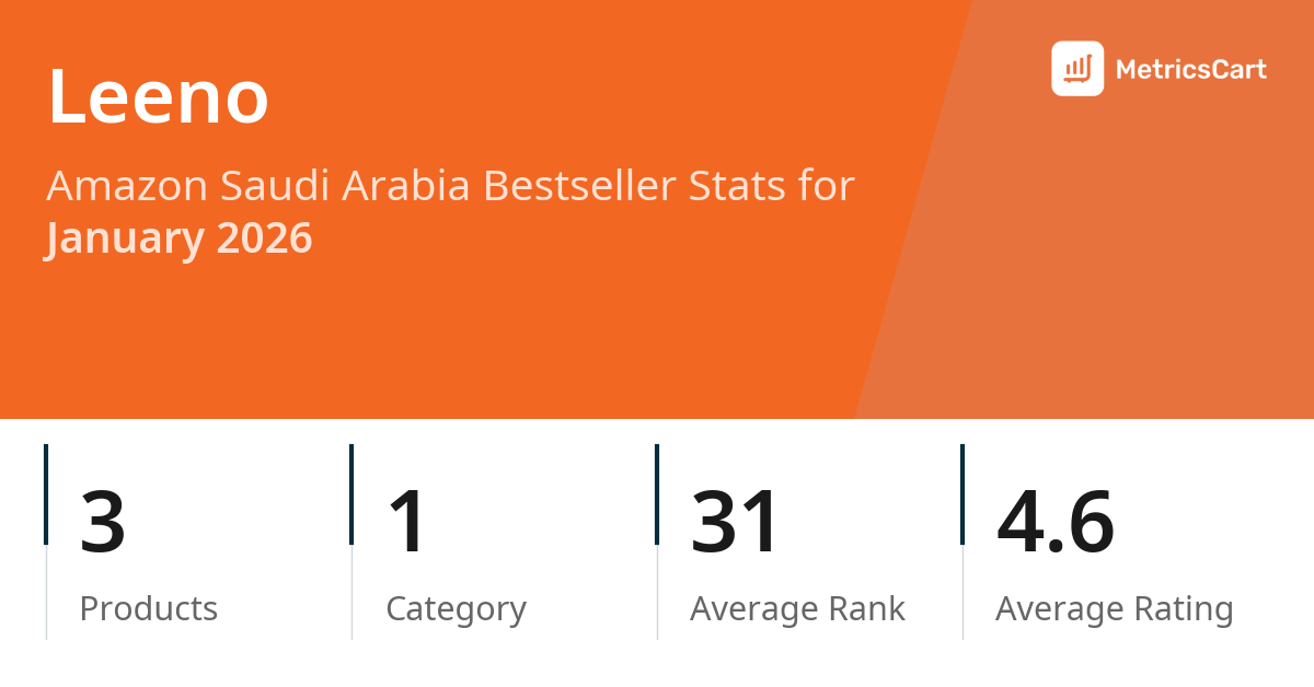 In January 2026, Leeno appeared on Amazon Saudi Arabia's bestseller lists with 3 unique products across 1 category. These products appeared in the category Office Products. The brand's products on the bestseller lists were priced between SAR 4.93 and SAR 22.00, with an average price of SAR 6.12. These bestselling products maintained an average rating of 4.6 based on 133 total ratings from customers who purchased products that appeared on the bestseller lists.