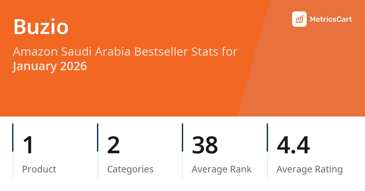 In January 2026, Buzio appeared on Amazon Saudi Arabia's bestseller lists with 1 unique product across 2 categories. These products appeared in categories including Home and Sporting Goods. The brand's products on the bestseller lists were priced between SAR 96.00 and SAR 109.00, with an average price of SAR 102.96. These bestselling products maintained an average rating of 4.4 based on 24K total ratings from customers who purchased products that appeared on the bestseller lists.