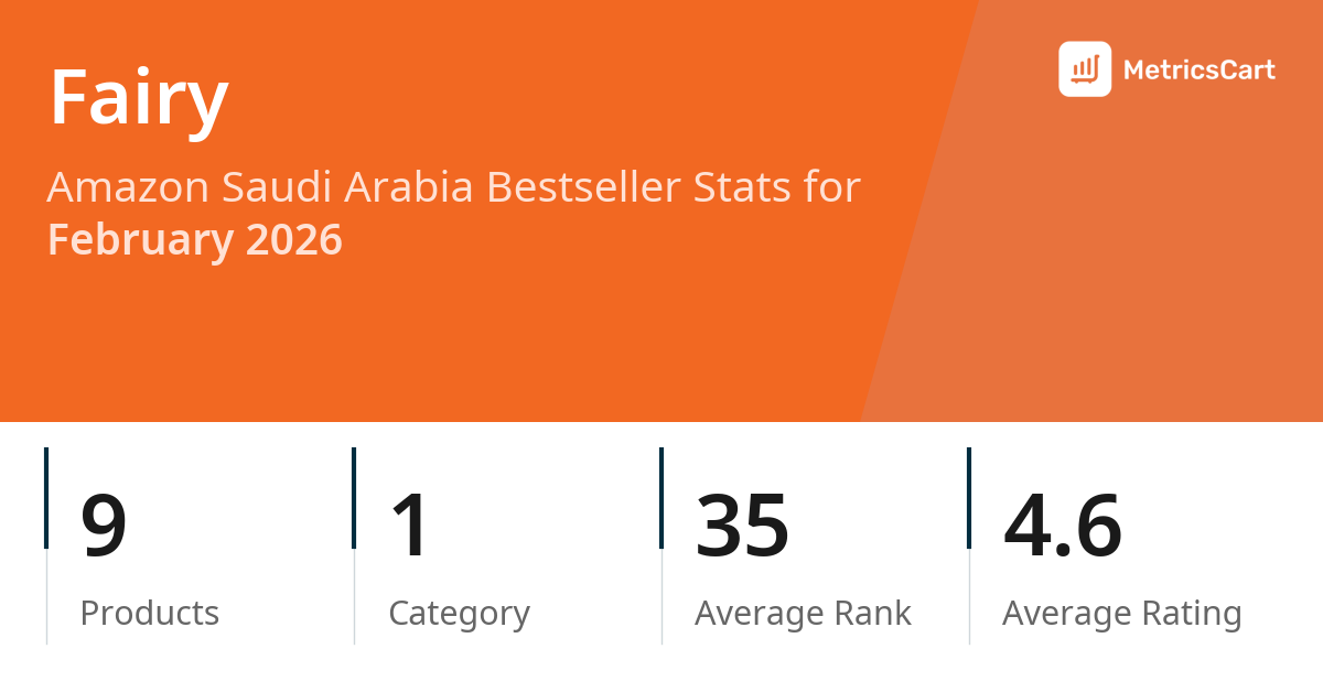 In February 2026, Fairy appeared on Amazon Saudi Arabia's bestseller lists with 9 unique products across 1 category. These products appeared in the category Health. The brand's products on the bestseller lists were priced between SAR 14.95 and SAR 54.95, with an average price of SAR 31.05. These bestselling products maintained an average rating of 4.6 based on 17K total ratings from customers who purchased products that appeared on the bestseller lists.