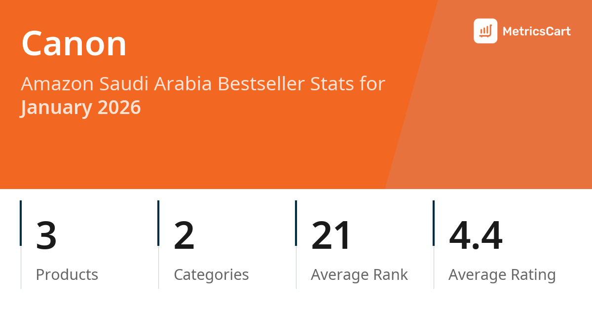In January 2026, Canon appeared on Amazon Saudi Arabia's bestseller lists with 3 unique products across 2 categories. These products appeared in categories including Office Products and Electronics. The brand's products on the bestseller lists were priced between SAR 107.86 and SAR 439.00, with an average price of SAR 153.59. These bestselling products maintained an average rating of 4.4 based on 22K total ratings from customers who purchased products that appeared on the bestseller lists.