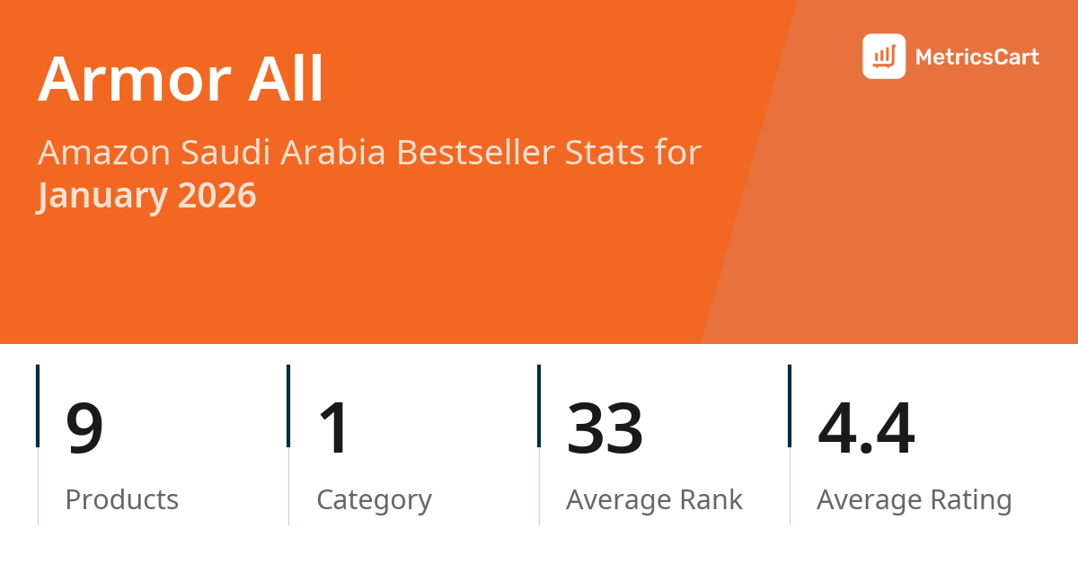 In January 2026, Armor All appeared on Amazon Saudi Arabia's bestseller lists with 9 unique products across 1 category. These products appeared in the category Automotive. The brand's products on the bestseller lists were priced between SAR 5.48 and SAR 52.12, with an average price of SAR 29.70. These bestselling products maintained an average rating of 4.4 based on 22K total ratings from customers who purchased products that appeared on the bestseller lists.