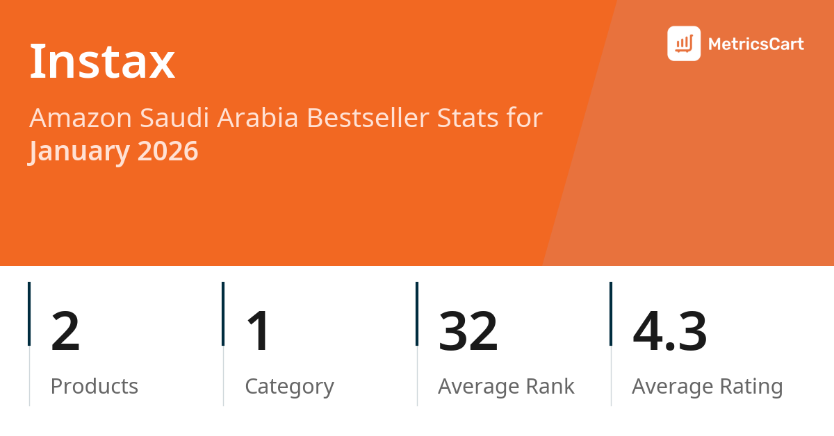 In January 2026, Instax appeared on Amazon Saudi Arabia's bestseller lists with 2 unique products across 1 category. These products appeared in the category Electronics. The brand's products on the bestseller lists were priced between SAR 69.00 and SAR 843.65, with an average price of SAR 321.38. These bestselling products maintained an average rating of 4.3 based on 221K total ratings from customers who purchased products that appeared on the bestseller lists.