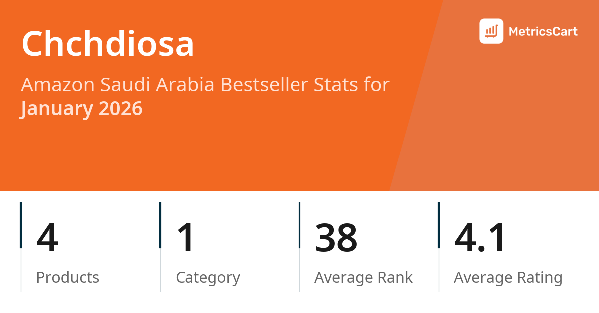 In January 2026, Chchdiosa appeared on Amazon Saudi Arabia's bestseller lists with 4 unique products across 1 category. These products appeared in the category Fashion. The brand's products on the bestseller lists were priced between SAR 92.50 and SAR 209.97, with an average price of SAR 127.86. These bestselling products maintained an average rating of 4.1 based on 387 total ratings from customers who purchased products that appeared on the bestseller lists.