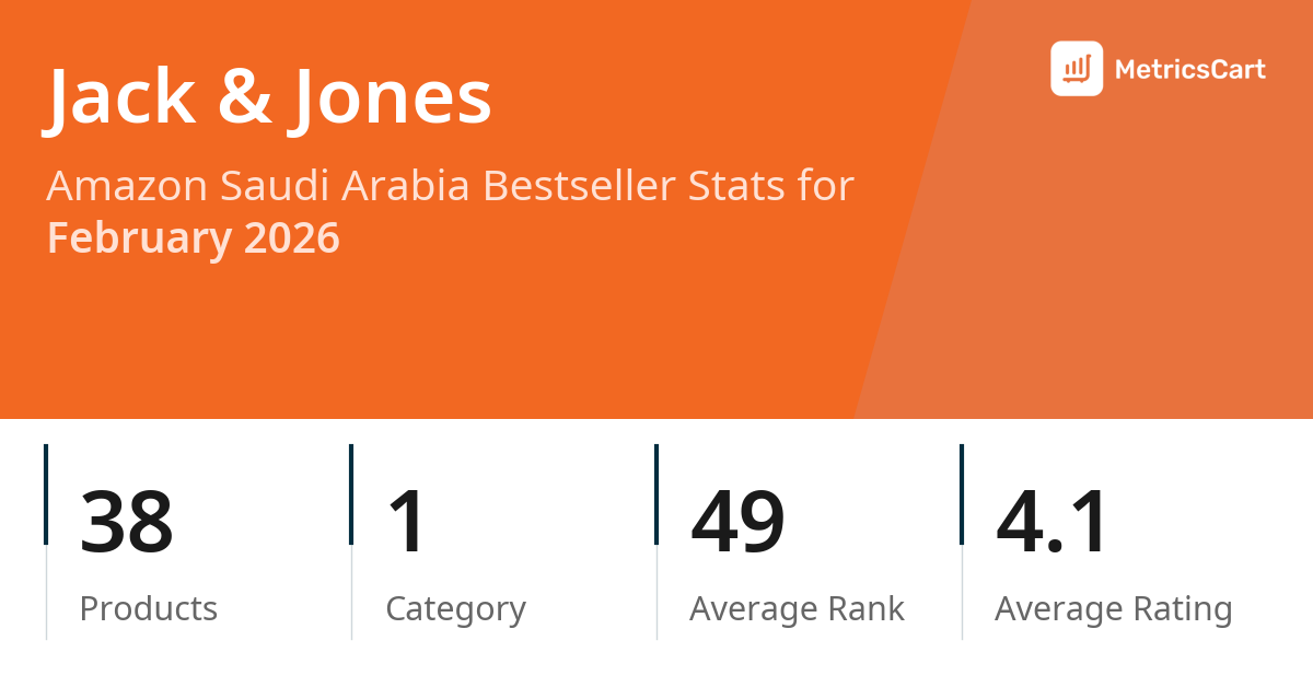 In February 2026, Jack & Jones appeared on Amazon Saudi Arabia's bestseller lists with 38 unique products across 1 category. These products appeared in the category Fashion. The brand's products on the bestseller lists were priced between SAR 33.00 and SAR 161.11, with an average price of SAR 66.01. These bestselling products maintained an average rating of 4.1 based on 290K total ratings from customers who purchased products that appeared on the bestseller lists.