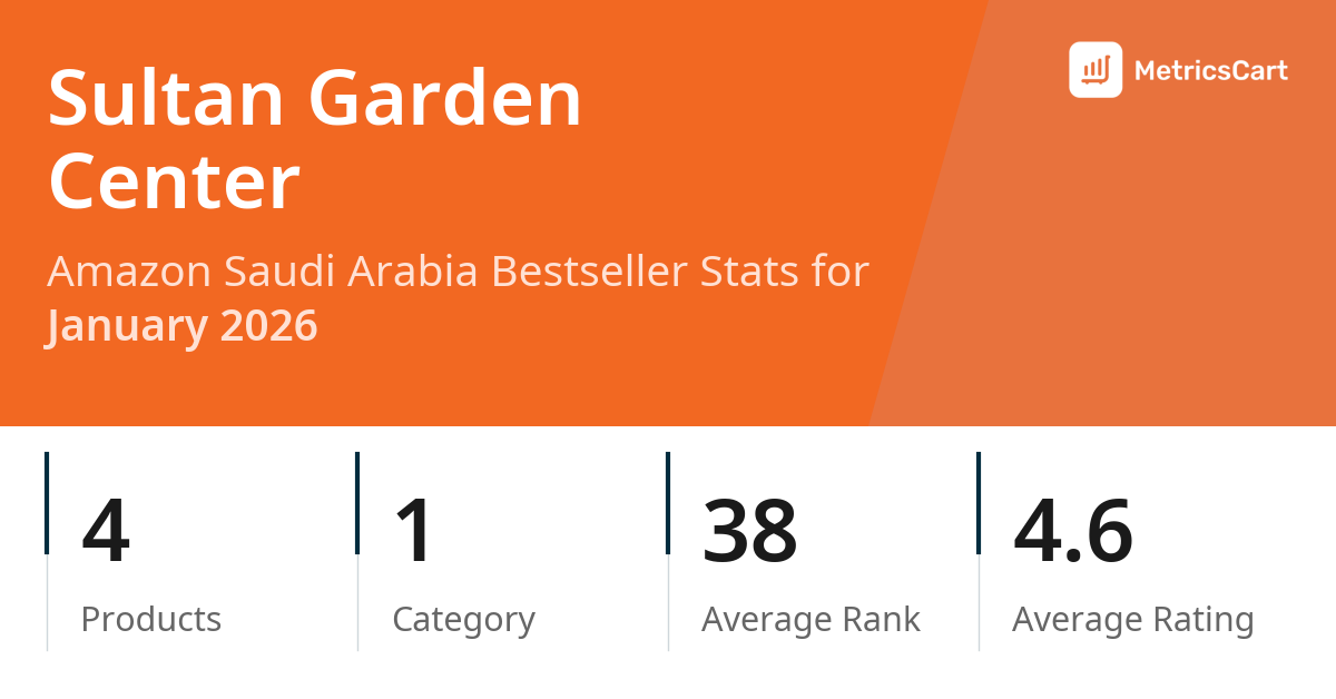In January 2026, Sultan Garden Center appeared on Amazon Saudi Arabia's bestseller lists with 4 unique products across 1 category. These products appeared in the category Patio, Lawn & Garden. The brand's products on the bestseller lists were priced between SAR 26.10 and SAR 105.95, with an average price of SAR 41.17. These bestselling products maintained an average rating of 4.6 based on 36 total ratings from customers who purchased products that appeared on the bestseller lists.