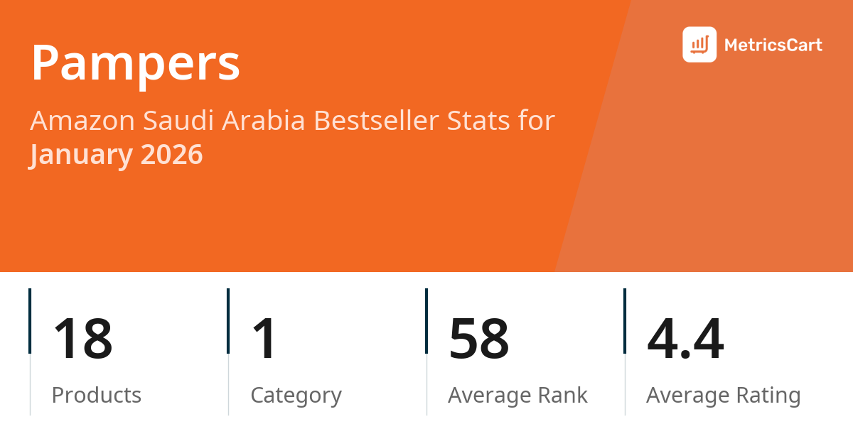 In January 2026, Pampers appeared on Amazon Saudi Arabia's bestseller lists with 18 unique products across 1 category. These products appeared in the category Baby Products. The brand's products on the bestseller lists were priced between SAR 36.48 and SAR 184.56, with an average price of SAR 84.65. These bestselling products maintained an average rating of 4.4 based on 5K total ratings from customers who purchased products that appeared on the bestseller lists.