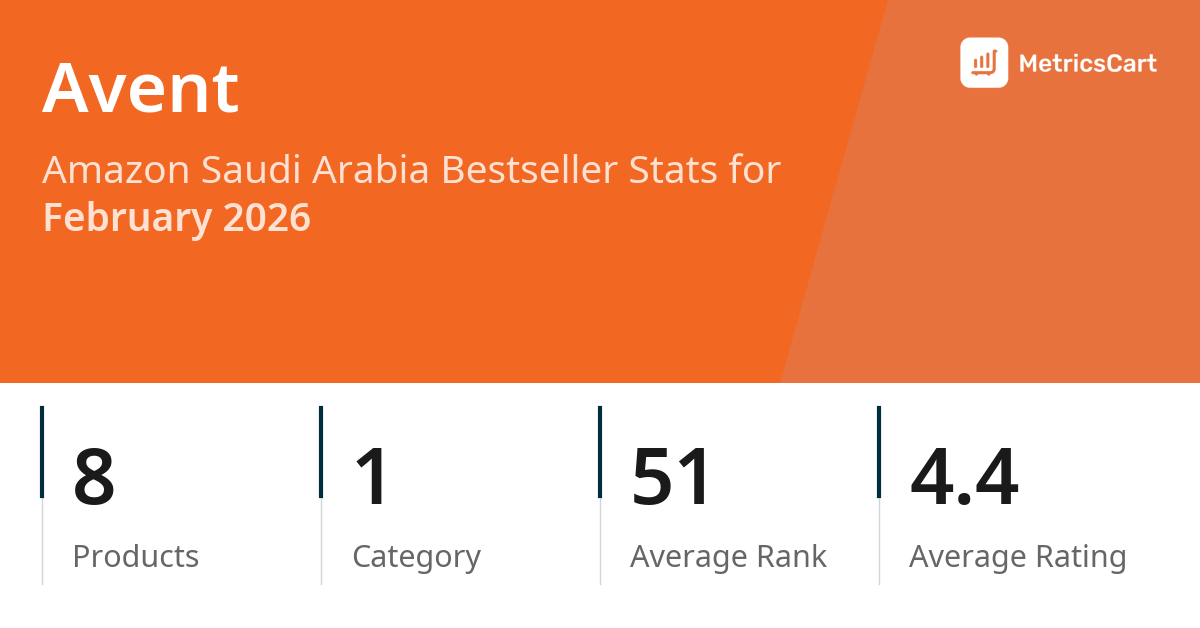In February 2026, Avent appeared on Amazon Saudi Arabia's bestseller lists with 8 unique products across 1 category. These products appeared in the category Baby Products. The brand's products on the bestseller lists were priced between SAR 35.15 and SAR 90.95, with an average price of SAR 54.02. These bestselling products maintained an average rating of 4.4 based on 3K total ratings from customers who purchased products that appeared on the bestseller lists.