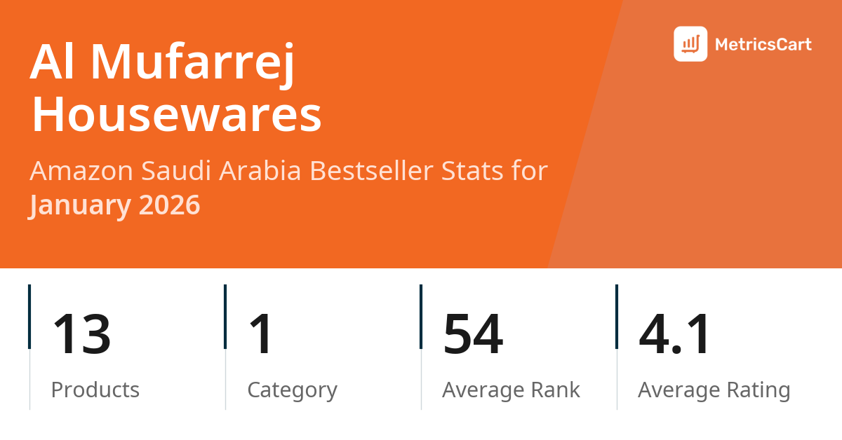 In January 2026, Al Mufarrej Housewares appeared on Amazon Saudi Arabia's bestseller lists with 13 unique products across 1 category. These products appeared in the category Home. The brand's products on the bestseller lists were priced between SAR 19.00 and SAR 118.00, with an average price of SAR 55.24. These bestselling products maintained an average rating of 4.1 based on 2K total ratings from customers who purchased products that appeared on the bestseller lists.