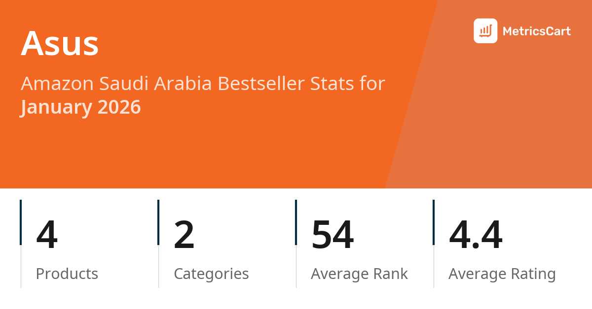 In January 2026, Asus appeared on Amazon Saudi Arabia's bestseller lists with 4 unique products across 2 categories. These products appeared in categories including Amazon Devices & Accessories and Electronics. The brand's products on the bestseller lists were priced between SAR 1,408.97 and SAR 2,998.98, with an average price of SAR 2,434.30. These bestselling products maintained an average rating of 4.4 based on 6K total ratings from customers who purchased products that appeared on the bestseller lists.