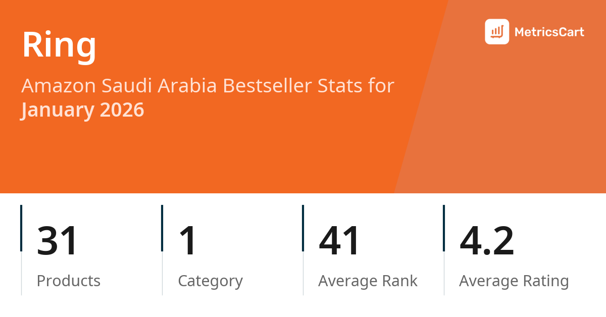 In January 2026, Ring appeared on Amazon Saudi Arabia's bestseller lists with 31 unique products across 1 category. These products appeared in the category Amazon Devices & Accessories. The brand's products on the bestseller lists were priced between SAR 59.00 and SAR 1,199.00, with an average price of SAR 339.86. These bestselling products maintained an average rating of 4.2 based on 20K total ratings from customers who purchased products that appeared on the bestseller lists.