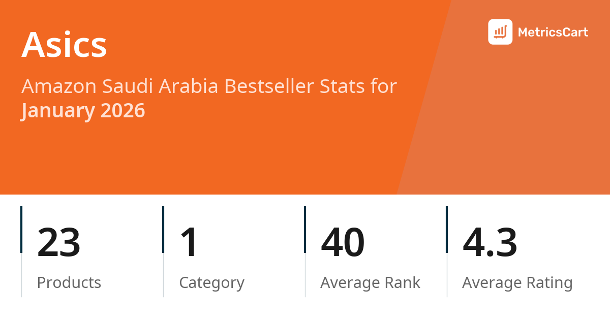 In January 2026, Asics appeared on Amazon Saudi Arabia's bestseller lists with 23 unique products across 1 category. These products appeared in the category Fashion. The brand's products on the bestseller lists were priced between SAR 404.39 and SAR 834.00, with an average price of SAR 637.19. These bestselling products maintained an average rating of 4.3 based on 21K total ratings from customers who purchased products that appeared on the bestseller lists.