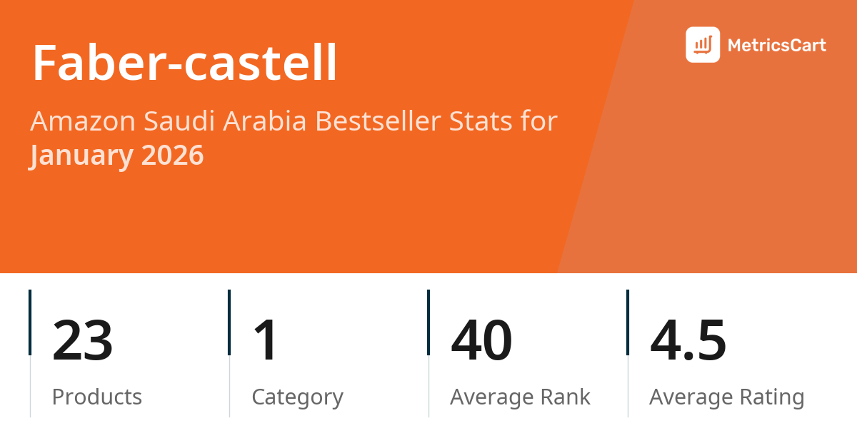 In January 2026, Faber-castell appeared on Amazon Saudi Arabia's bestseller lists with 23 unique products across 1 category. These products appeared in the category Office Products. The brand's products on the bestseller lists were priced between SAR 3.14 and SAR 39.00, with an average price of SAR 9.39. These bestselling products maintained an average rating of 4.5 based on 7K total ratings from customers who purchased products that appeared on the bestseller lists.