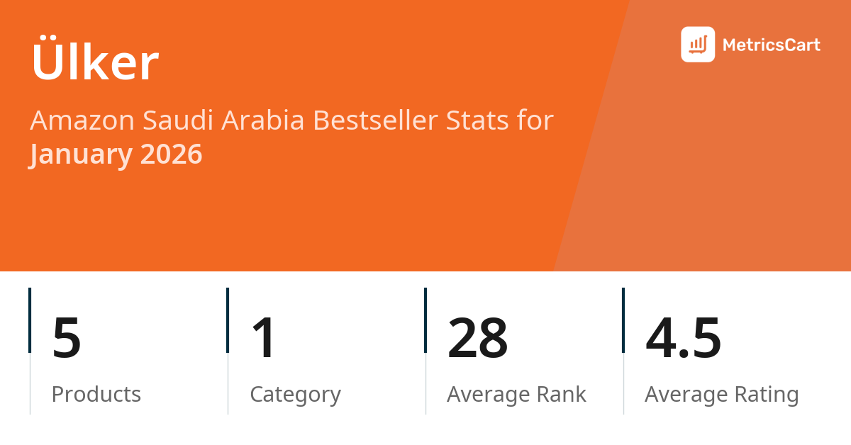 In January 2026, Ülker appeared on Amazon Saudi Arabia's bestseller lists with 5 unique products across 1 category. These products appeared in the category Grocery. The brand's products on the bestseller lists were priced between SAR 7.65 and SAR 10.95, with an average price of SAR 9.28. These bestselling products maintained an average rating of 4.5 based on 6K total ratings from customers who purchased products that appeared on the bestseller lists.