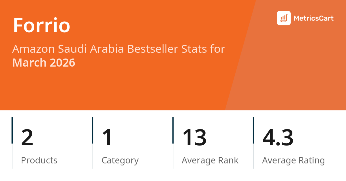 In March 2026, Forrio appeared on Amazon Saudi Arabia's bestseller lists with 2 unique products across 1 category. These products appeared in the category DIY & Tools. The brand's products on the bestseller lists were priced between SAR 35.99 and SAR 145.99, with an average price of SAR 73.99. These bestselling products maintained an average rating of 4.3 based on 481 total ratings from customers who purchased products that appeared on the bestseller lists.