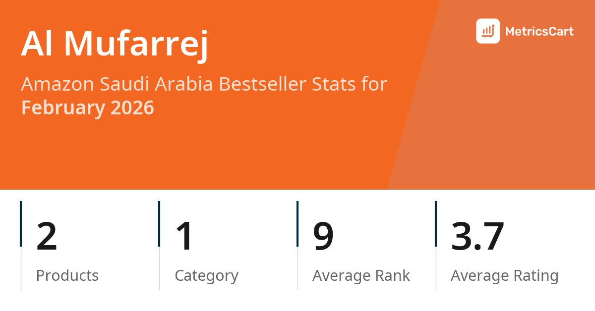 In February 2026, Al Mufarrej appeared on Amazon Saudi Arabia's bestseller lists with 2 unique products across 1 category. These products appeared in the category Home. The brand's products on the bestseller lists were priced between SAR 49.00 and SAR 87.00, with an average price of SAR 61.67. These bestselling products maintained an average rating of 3.7 based on 400 total ratings from customers who purchased products that appeared on the bestseller lists.