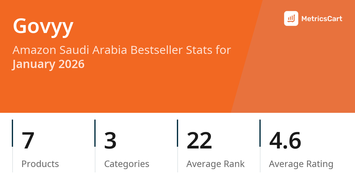 In January 2026, Govyy appeared on Amazon Saudi Arabia's bestseller lists with 7 unique products across 3 categories. These products appeared in categories including Health, Home, and Fashion. The brand's products on the bestseller lists were priced between SAR 9.00 and SAR 110.95, with an average price of SAR 43.94. These bestselling products maintained an average rating of 4.6 based on 3K total ratings from customers who purchased products that appeared on the bestseller lists.