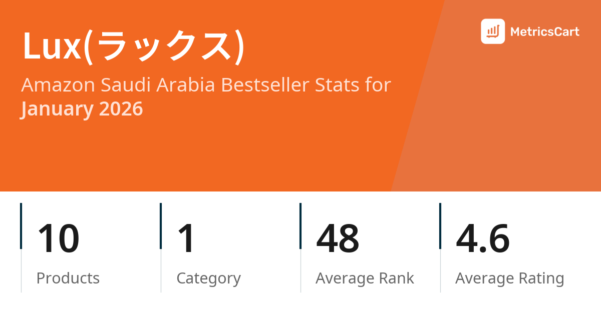 In January 2026, Lux(ラックス) appeared on Amazon Saudi Arabia's bestseller lists with 10 unique products across 1 category. These products appeared in the category Beauty. The brand's products on the bestseller lists were priced between SAR 6.80 and SAR 23.99, with an average price of SAR 15.98. These bestselling products maintained an average rating of 4.6 based on 9K total ratings from customers who purchased products that appeared on the bestseller lists.