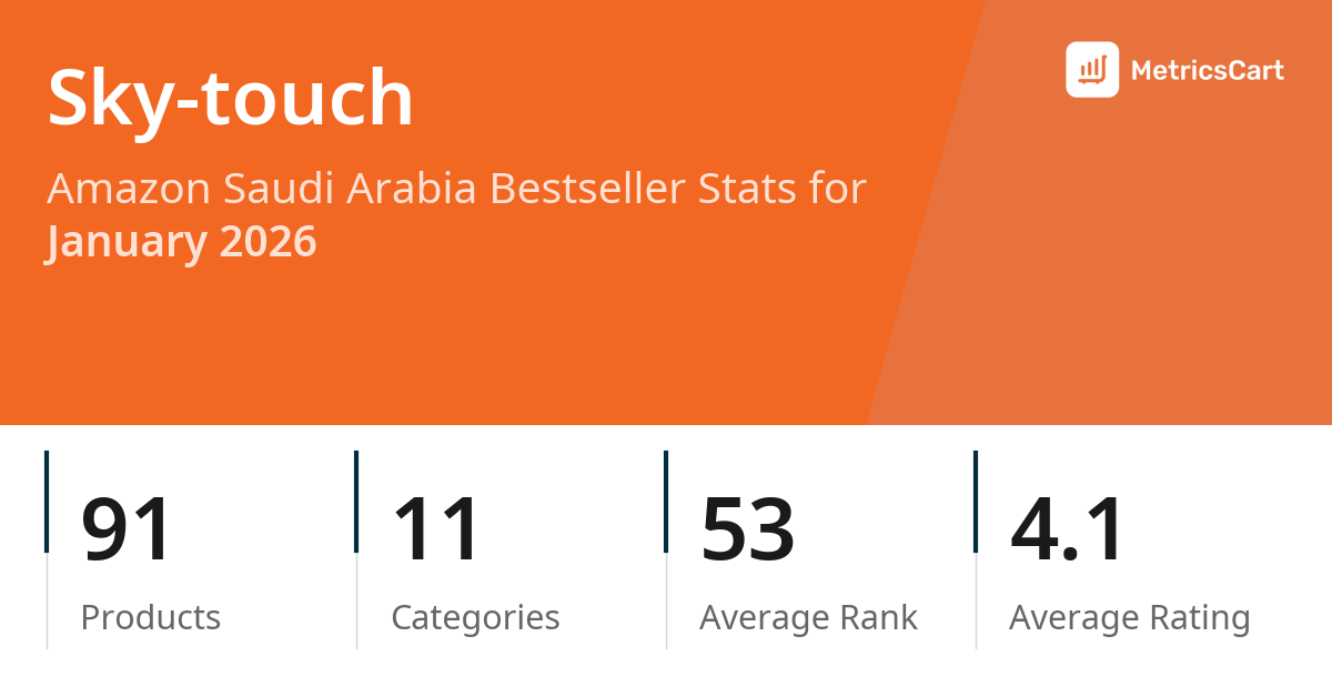 In January 2026, Sky-touch appeared on Amazon Saudi Arabia's bestseller lists with 91 unique products across 11 categories. These products appeared in categories including Patio, Lawn & Garden, Fashion, and Toys. The brand's products on the bestseller lists were priced between SAR 6.42 and SAR 231.20, with an average price of SAR 48.80. These bestselling products maintained an average rating of 4.1 based on 29K total ratings from customers who purchased products that appeared on the bestseller lists.