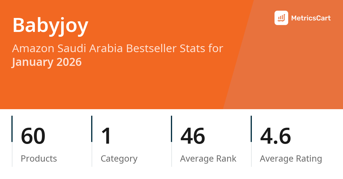 In January 2026, Babyjoy appeared on Amazon Saudi Arabia's bestseller lists with 60 unique products across 1 category. These products appeared in the category Baby Products. The brand's products on the bestseller lists were priced between SAR 22.10 and SAR 230.97, with an average price of SAR 102.74. These bestselling products maintained an average rating of 4.6 based on 57K total ratings from customers who purchased products that appeared on the bestseller lists.