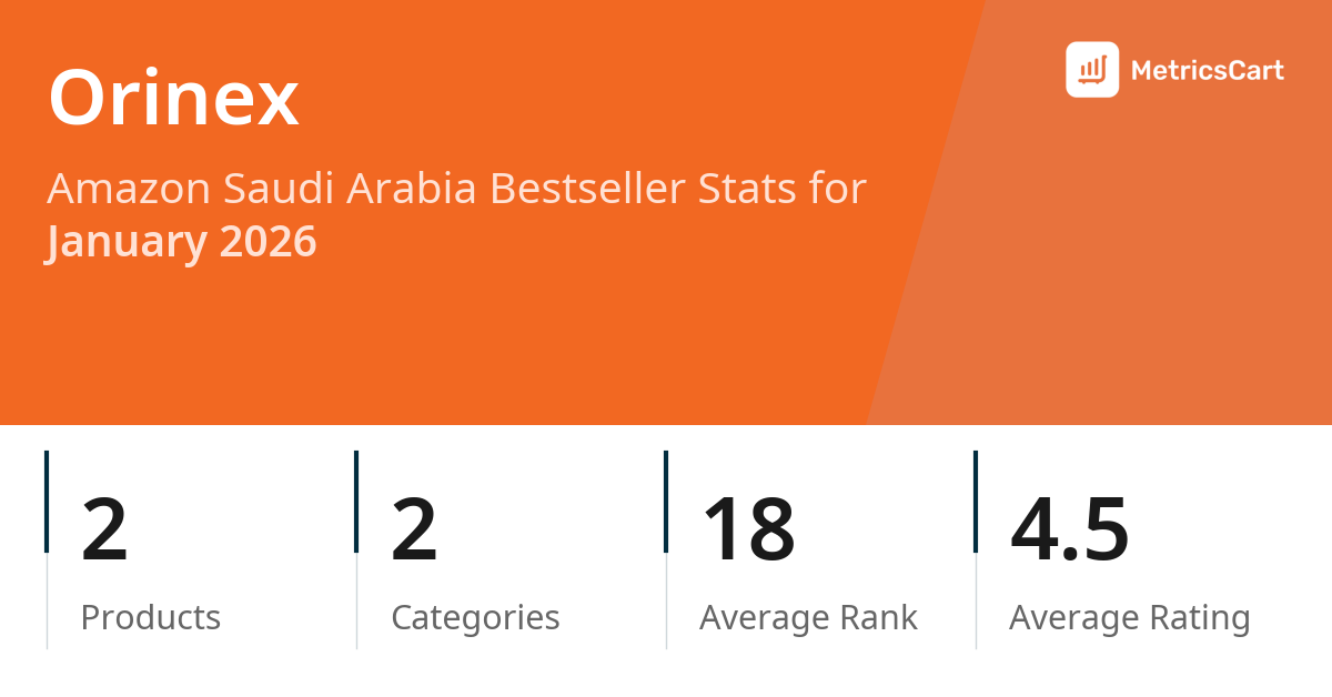 In January 2026, Orinex appeared on Amazon Saudi Arabia's bestseller lists with 2 unique products across 2 categories. These products appeared in categories including DIY & Tools and Home. The brand's products on the bestseller lists were priced between SAR 7.35 and SAR 11.61, with an average price of SAR 10.70. These bestselling products maintained an average rating of 4.5 based on 443 total ratings from customers who purchased products that appeared on the bestseller lists.