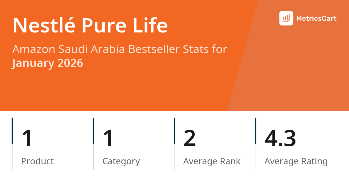 In January 2026, Nestlé Pure Life appeared on Amazon Saudi Arabia's bestseller lists with 1 unique product across 1 category. These products appeared in the category Grocery. The brand's products on the bestseller lists were priced between SAR 10.78 and SAR 11.90, with an average price of SAR 11.20. These bestselling products maintained an average rating of 4.3 based on 3K total ratings from customers who purchased products that appeared on the bestseller lists.