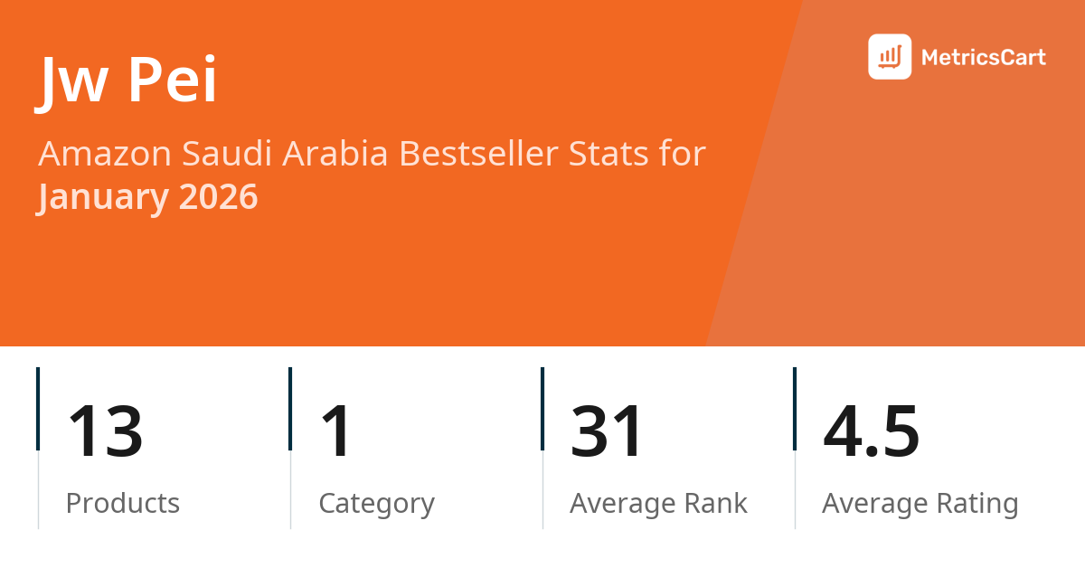 In January 2026, Jw Pei appeared on Amazon Saudi Arabia's bestseller lists with 13 unique products across 1 category. These products appeared in the category Fashion. The brand's products on the bestseller lists were priced between SAR 316.00 and SAR 570.00, with an average price of SAR 399.81. These bestselling products maintained an average rating of 4.5 based on 4K total ratings from customers who purchased products that appeared on the bestseller lists.