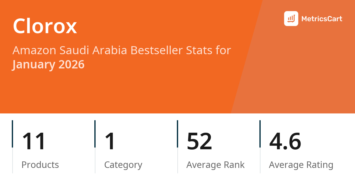 In January 2026, Clorox appeared on Amazon Saudi Arabia's bestseller lists with 11 unique products across 1 category. These products appeared in the category Health. The brand's products on the bestseller lists were priced between SAR 8.00 and SAR 46.95, with an average price of SAR 18.57. These bestselling products maintained an average rating of 4.6 based on 16K total ratings from customers who purchased products that appeared on the bestseller lists.