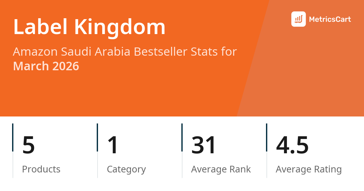 In March 2026, Label Kingdom appeared on Amazon Saudi Arabia's bestseller lists with 5 unique products across 1 category. These products appeared in the category Office Products. The brand's products on the bestseller lists were priced between SAR 55.99 and SAR 118.99, with an average price of SAR 74.84. These bestselling products maintained an average rating of 4.5 based on 1K total ratings from customers who purchased products that appeared on the bestseller lists.