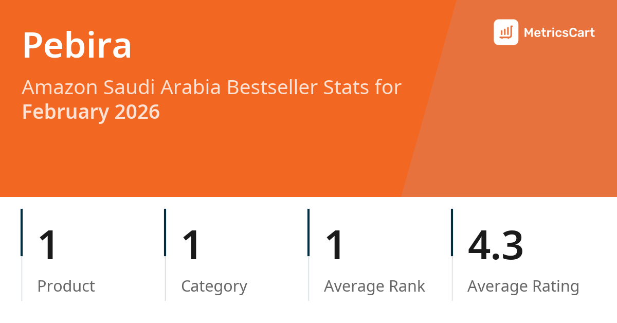 In February 2026, Pebira appeared on Amazon Saudi Arabia's bestseller lists with 1 unique product across 1 category. These products appeared in the category Toys. The brand's products on the bestseller lists were priced between SAR 10.97 and SAR 31.00, with an average price of SAR 17.65. These bestselling products maintained an average rating of 4.3 based on 8K total ratings from customers who purchased products that appeared on the bestseller lists.