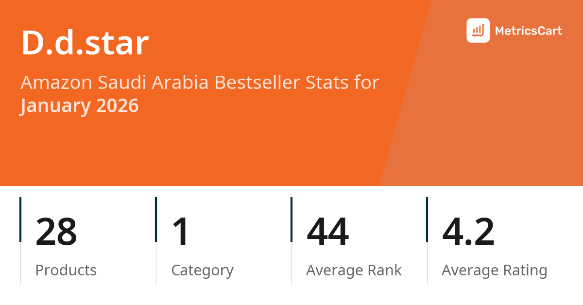 In January 2026, D.d.star appeared on Amazon Saudi Arabia's bestseller lists with 28 unique products across 1 category. These products appeared in the category Fashion. The brand's products on the bestseller lists were priced between SAR 31.78 and SAR 118.76, with an average price of SAR 73.73. These bestselling products maintained an average rating of 4.2 based on 7K total ratings from customers who purchased products that appeared on the bestseller lists.