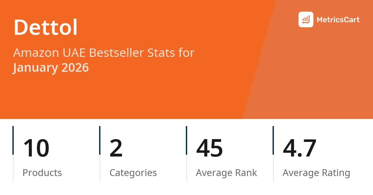 In January 2026, Dettol appeared on Amazon UAE's bestseller lists with 10 unique products across 2 categories. These products appeared in categories including Health and Beauty. The brand's products on the bestseller lists were priced between AED 7.95 and AED 40.90, with an average price of AED 29.20. These bestselling products maintained an average rating of 4.7 based on 9K total ratings from customers who purchased products that appeared on the bestseller lists.