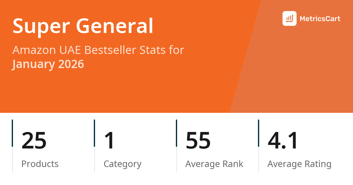 In January 2026, Super General appeared on Amazon UAE's bestseller lists with 25 unique products across 1 category. These products appeared in the category Appliances. The brand's products on the bestseller lists were priced between AED 319.50 and AED 1,749.00, with an average price of AED 834.97. These bestselling products maintained an average rating of 4.1 based on 2K total ratings from customers who purchased products that appeared on the bestseller lists.