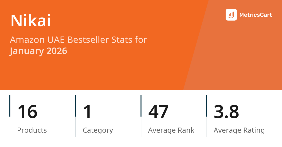 In January 2026, Nikai appeared on Amazon UAE's bestseller lists with 16 unique products across 1 category. These products appeared in the category Appliances. The brand's products on the bestseller lists were priced between AED 299.00 and AED 1,394.00, with an average price of AED 509.87. These bestselling products maintained an average rating of 3.8 based on 4K total ratings from customers who purchased products that appeared on the bestseller lists.