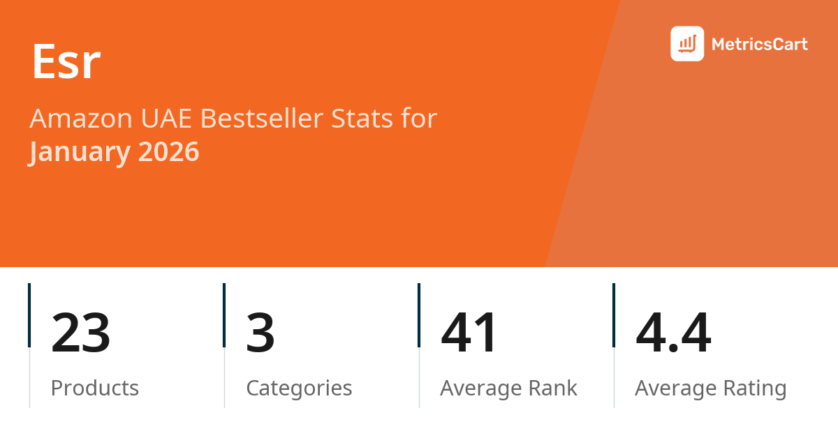 In January 2026, Esr appeared on Amazon UAE's bestseller lists with 23 unique products across 3 categories. These products appeared in categories including Mobile Phones & Communication Products, Computers, and Electronics. The brand's products on the bestseller lists were priced between AED 18.48 and AED 87.54, with an average price of AED 45.12. These bestselling products maintained an average rating of 4.4 based on 730K total ratings from customers who purchased products that appeared on the bestseller lists.