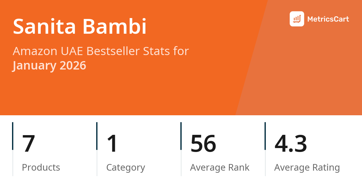 In January 2026, Sanita Bambi appeared on Amazon UAE's bestseller lists with 7 unique products across 1 category. These products appeared in the category Baby Products. The brand's products on the bestseller lists were priced between AED 52.39 and AED 127.58, with an average price of AED 65.81. These bestselling products maintained an average rating of 4.3 based on 6K total ratings from customers who purchased products that appeared on the bestseller lists.