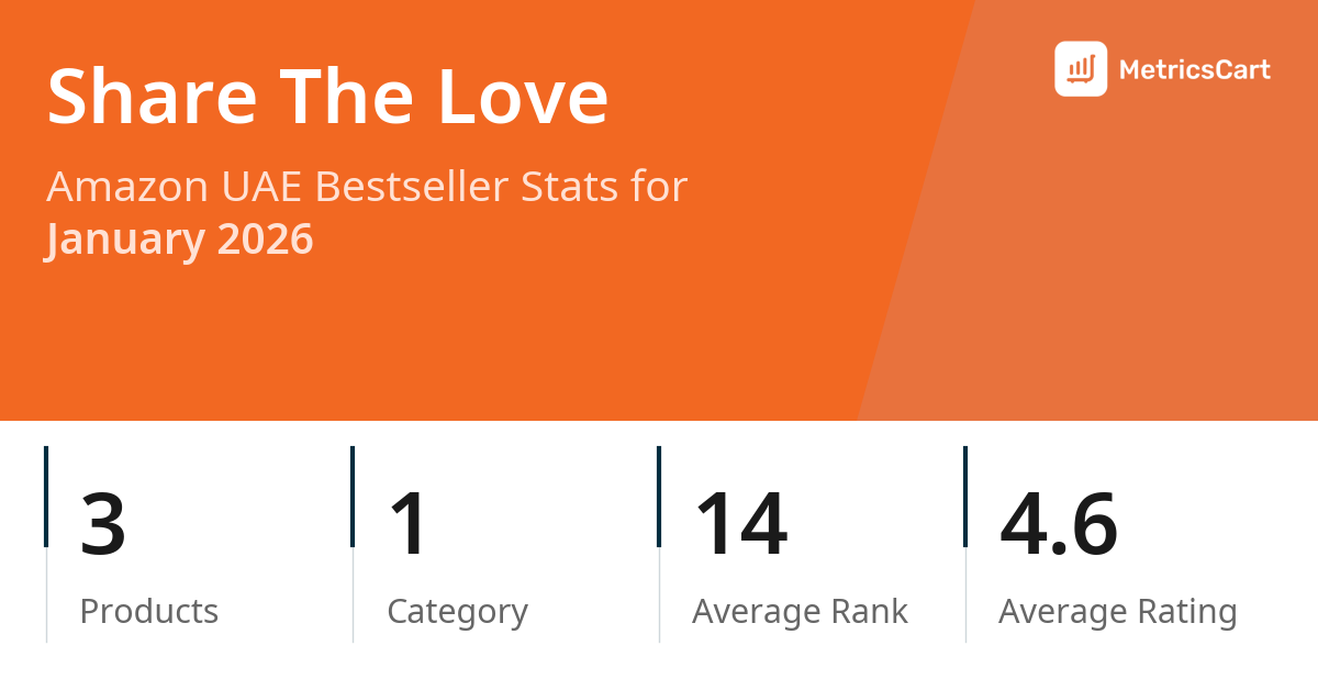 In January 2026, Share The Love appeared on Amazon UAE's bestseller lists with 3 unique products across 1 category. These products appeared in the category Office Products. The brand's products on the bestseller lists were priced between AED 7.00 and AED 11.50, with an average price of AED 8.20. These bestselling products maintained an average rating of 4.6 based on 72 total ratings from customers who purchased products that appeared on the bestseller lists.
