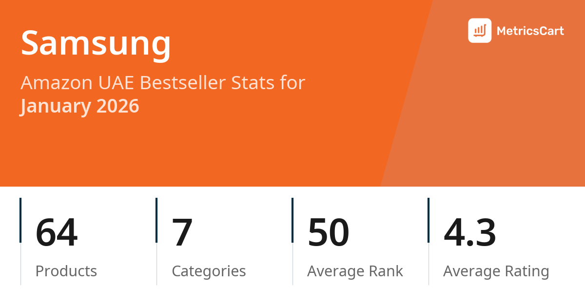In January 2026, Samsung appeared on Amazon UAE's bestseller lists with 64 unique products across 7 categories. These products appeared in categories including Mobile Phones & Communication Products, Appliances, and Amazon Devices & Accessories. The brand's products on the bestseller lists were priced between AED 45.00 and AED 7,599.00, with an average price of AED 1,286.29. These bestselling products maintained an average rating of 4.3 based on 95K total ratings from customers who purchased products that appeared on the bestseller lists.
