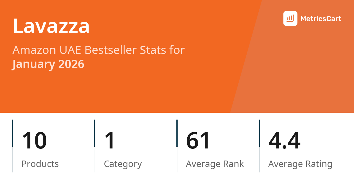 In January 2026, Lavazza appeared on Amazon UAE's bestseller lists with 10 unique products across 1 category. These products appeared in the category Grocery. The brand's products on the bestseller lists were priced between AED 18.25 and AED 126.00, with an average price of AED 50.87. These bestselling products maintained an average rating of 4.4 based on 102K total ratings from customers who purchased products that appeared on the bestseller lists.