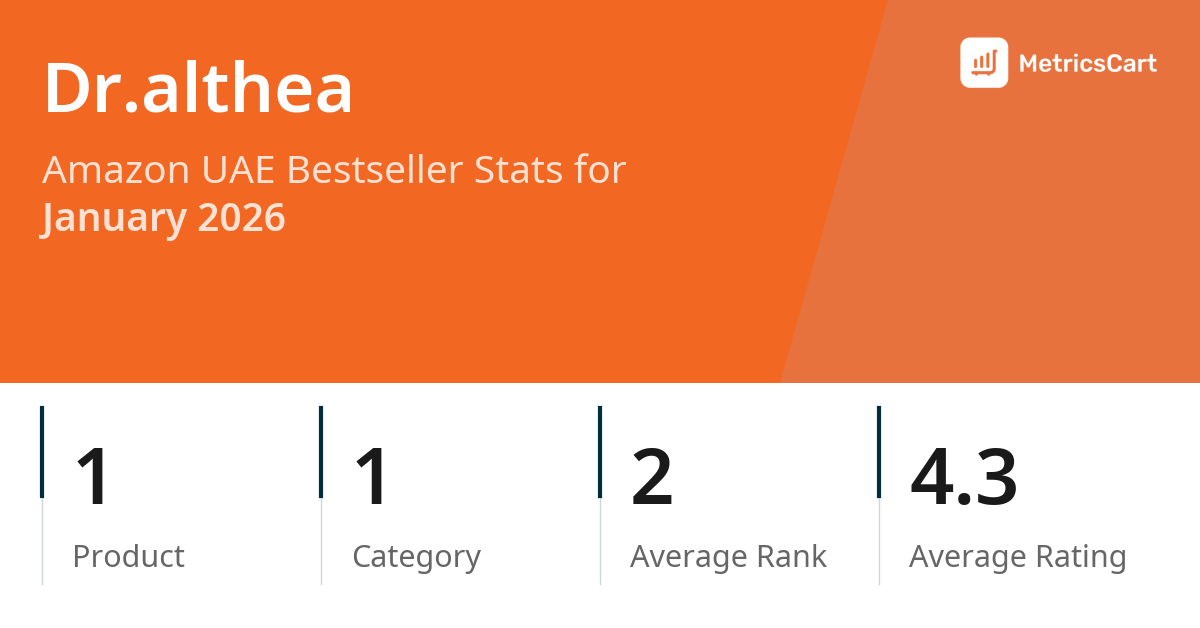 In January 2026, Dr.althea appeared on Amazon UAE's bestseller lists with 1 unique product across 1 category. These products appeared in the category Beauty. The brand's products on the bestseller lists were priced between AED 54.26 and AED 61.93, with an average price of AED 55.96. These bestselling products maintained an average rating of 4.3 based on 11K total ratings from customers who purchased products that appeared on the bestseller lists.