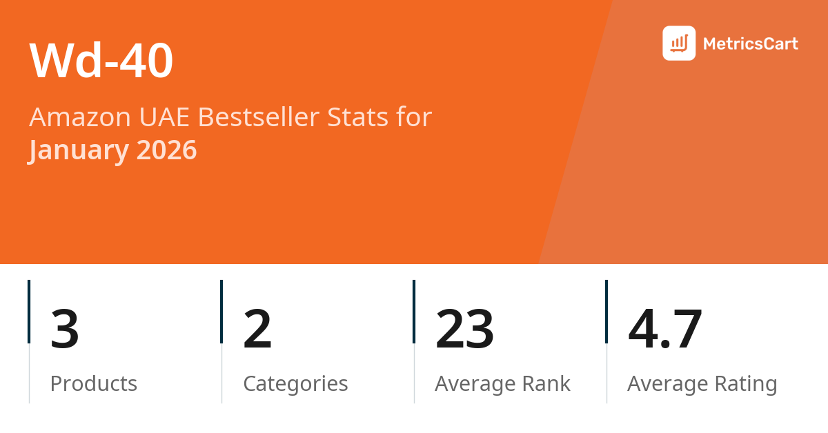 In January 2026, Wd-40 appeared on Amazon UAE's bestseller lists with 3 unique products across 2 categories. These products appeared in categories including Automotive and Tools & Home Improvement. The brand's products on the bestseller lists were priced between AED 10.00 and AED 45.00, with an average price of AED 16.56. These bestselling products maintained an average rating of 4.7 based on 28K total ratings from customers who purchased products that appeared on the bestseller lists.