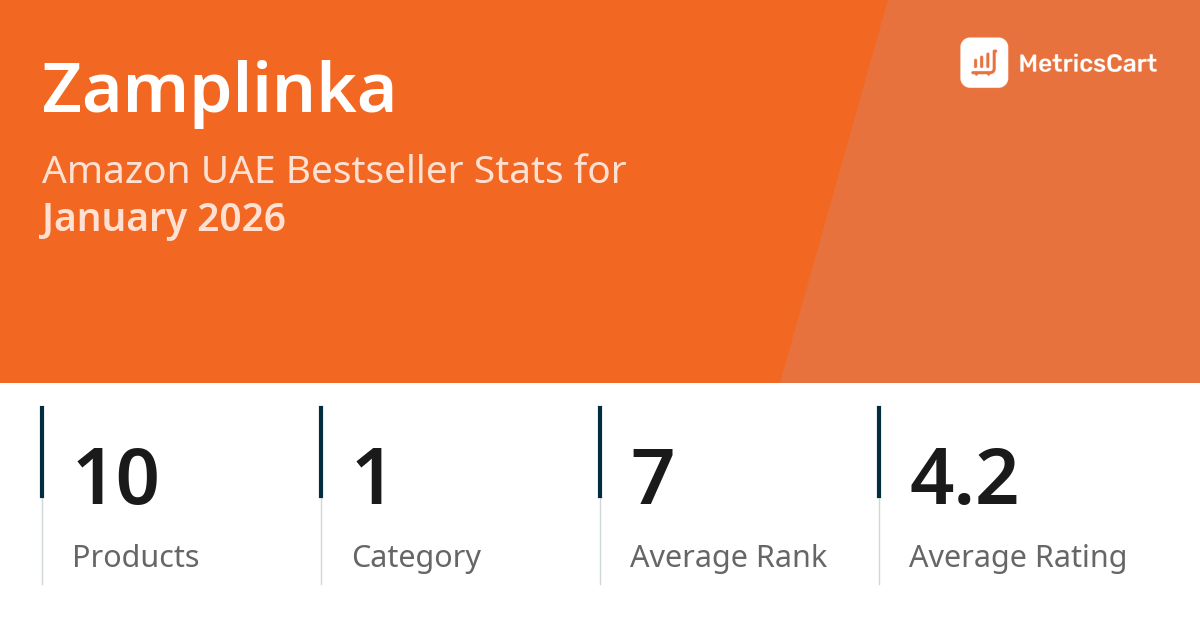 In January 2026, Zamplinka appeared on Amazon UAE's bestseller lists with 10 unique products across 1 category. These products appeared in the category Fashion. The brand's products on the bestseller lists were priced between AED 32.99 and AED 36.99, with an average price of AED 35.05. These bestselling products maintained an average rating of 4.2 based on 203 total ratings from customers who purchased products that appeared on the bestseller lists.