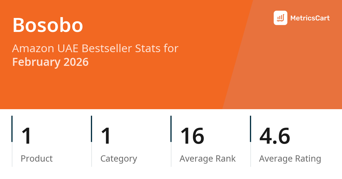 In February 2026, Bosobo appeared on Amazon UAE's bestseller lists with 1 unique product across 1 category. These products appeared in the category Office Products. The brand's products on the bestseller lists were priced between AED 10.00 and AED 11.97, with an average price of AED 10.66. These bestselling products maintained an average rating of 4.6 based on 57K total ratings from customers who purchased products that appeared on the bestseller lists.